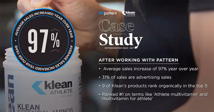 Welcome to our blog series called, “Why Brands Work With Pattern.” Each week we discuss why the top brands in ecommerce turn to Pattern to drive global, profitable growth and control. This week we are highlighting Klean. Klean, with Pattern's team of ecommerce advertising experts, ranked #1 on key search terms like ’Athlete multivitamin’ and ‘multivitamin for athlete.’ See what we accomplished together below and download the case study PDF here.